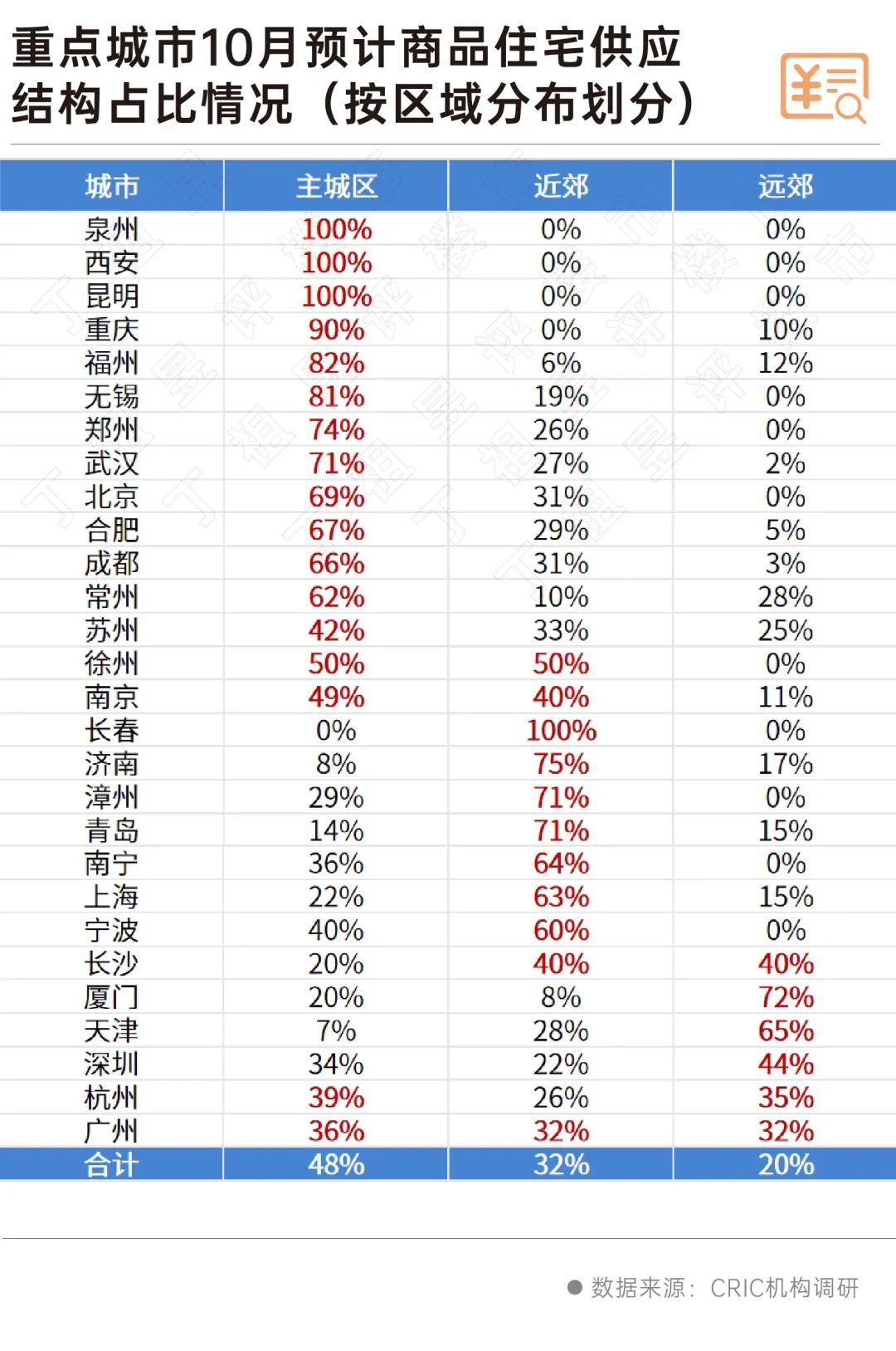 从供应结构各项目区域分布来看,重点城市主城、近郊、远郊占比结构为48%、32%和20%,主城区仍是供应重心。