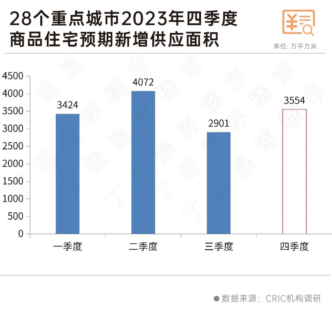 根据CRIC调研,28个重点城市2023年四季度商品住宅预期新增供应面积3554万平方米,环比三季度上涨23%。