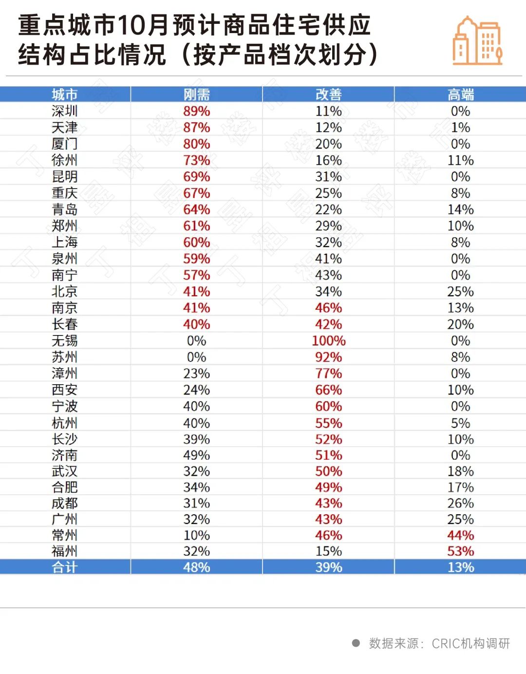 而上海、北京和深圳也加强了刚需产品的供应,其中深圳刚需产品供应占比高达89%。