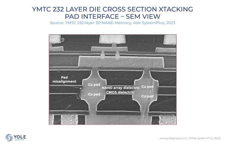 此前,国外行业研究机构yolegroup对长江存储的232层闪存颗粒进行了拆解分析。他们发现,长江存储的颗粒采用了双层设计,即通过Xtacking技术,将双层晶圆叠放在一起。这样做虽然有良率低、成本高的问题,但却绕过了对被限制的先进工艺、工具的依赖。