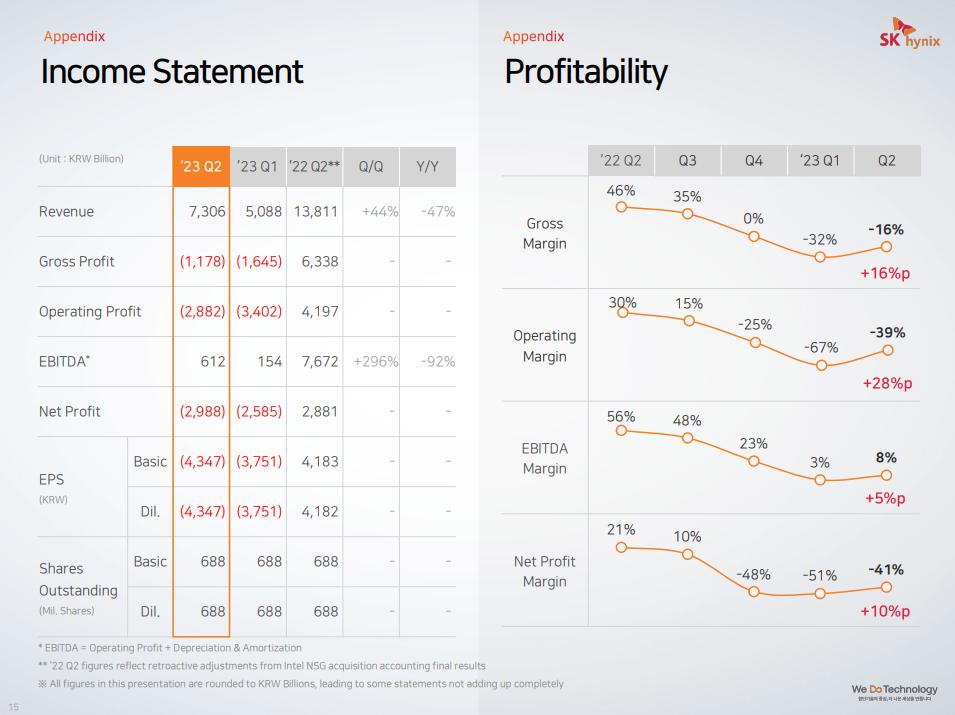 根据7月底SK海力士公布的2023年Q2财报显示,第二季度营收为7.3059万亿韩元,同比下滑47%;营业亏损额达2.8821万亿韩元,虽然已经比上一季度好了15%,但同比依旧是亏;净亏损额达2.9879万亿韩元,环比下滑16%。
