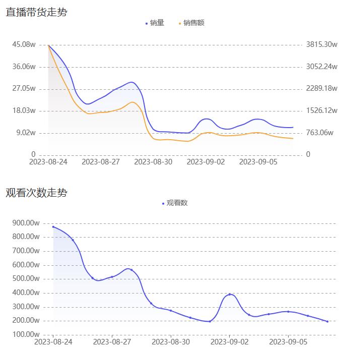 不止淘宝的李佳琦,从抖音发迹的“后辈”东方甄选同样面临流量下滑的问题。特别是在8月底入淘前后的半个月里,第三方数据平台“红人点集”数据显示,不管是带货销量、销售额还是观看次数,东方甄选直播间都呈现明显的下滑趋势。