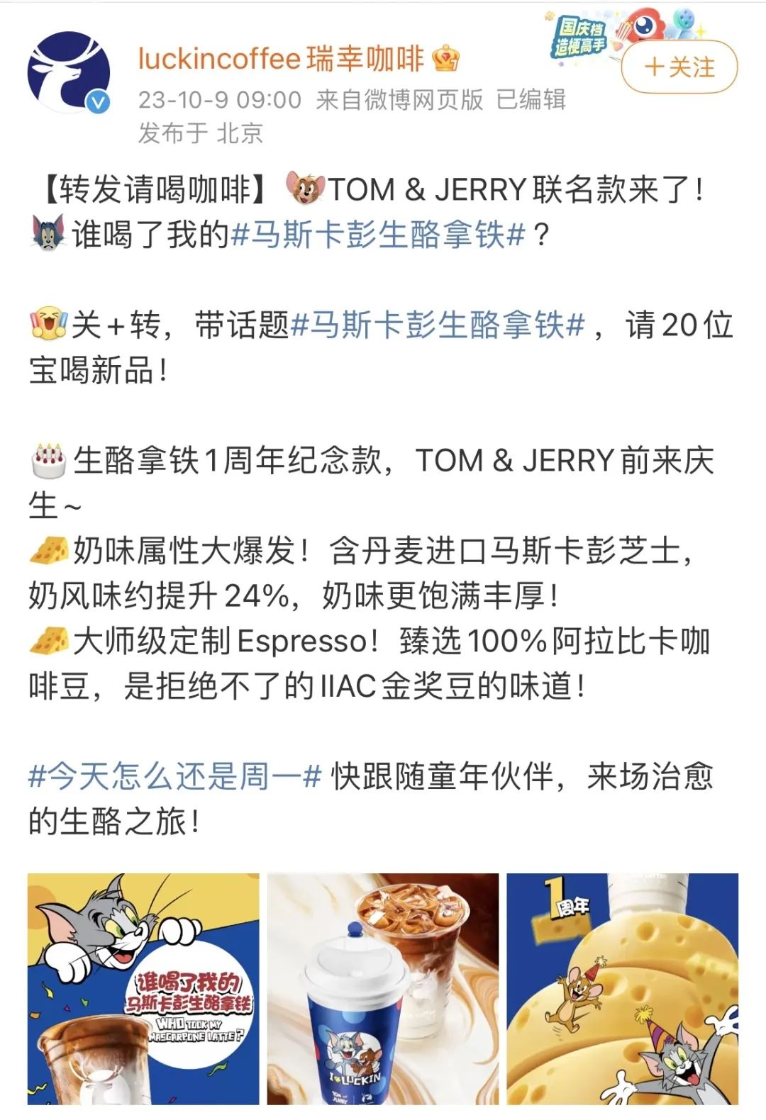 10月9日,瑞幸咖啡再次推出联名咖啡“马斯卡彭生酪拿铁”,这次是和经典动画IP“猫和老鼠”联名,联名款一经推出再登上微博热搜。