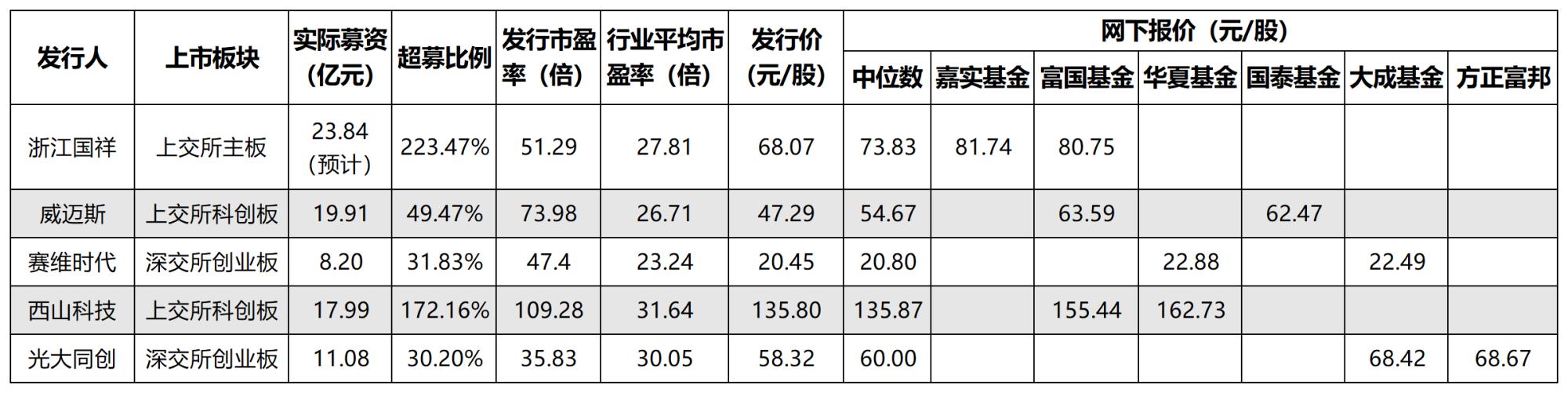 本次浙江国祥IPO网下全部投资者报价中位数为73.83元/股,发行价定为68.07元/股。在所有有效报价中,最高价是嘉实基金报出的81.74元/股,较中位数高出10.72%,较发行价高出20.08%。次高价是富国基金报出的80.75元/股,较中位数、发行价分别高出9.37%、18.63%。