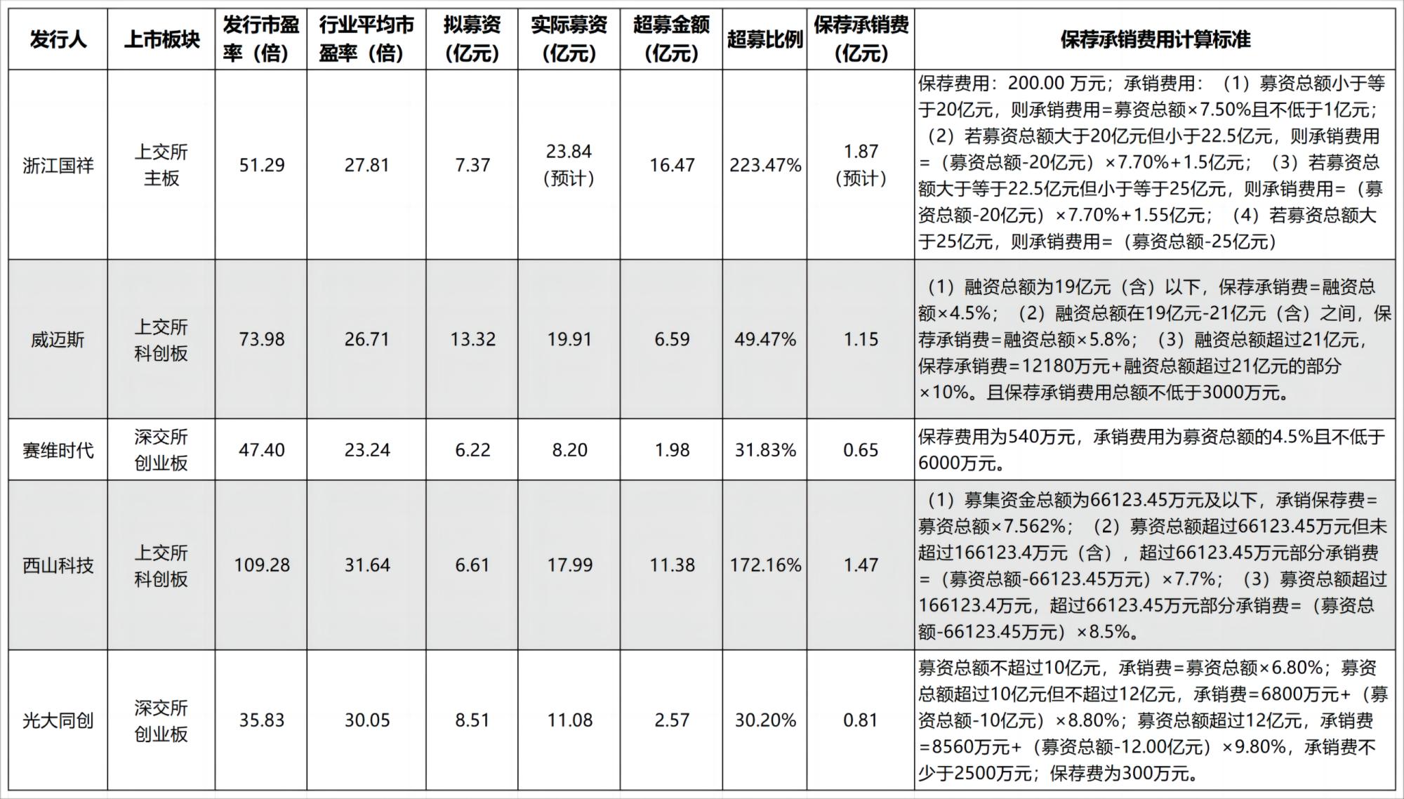 其中,最大的一单来自西山科技,保荐承销费1.47亿元。相应的,西山科技项目也是超募比例最高的项目。在上交所科创板上市的西山科技发行市盈率109.28倍,是行业平均市盈率(31.64倍)的3.45倍。西山科技拟募资金额为6.61亿元,实际募资总额17.99亿元,超募比例达172.16%。