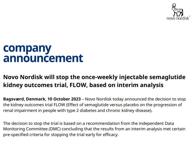 诺和诺德本次关于停止肾脏结果试验 FLOW 的决定,是基于独立的数据监测委员会(DMC)建议。委员会通过分析研究的中期结果,认为其符合提前停止试验的预定疗效标准。[1]