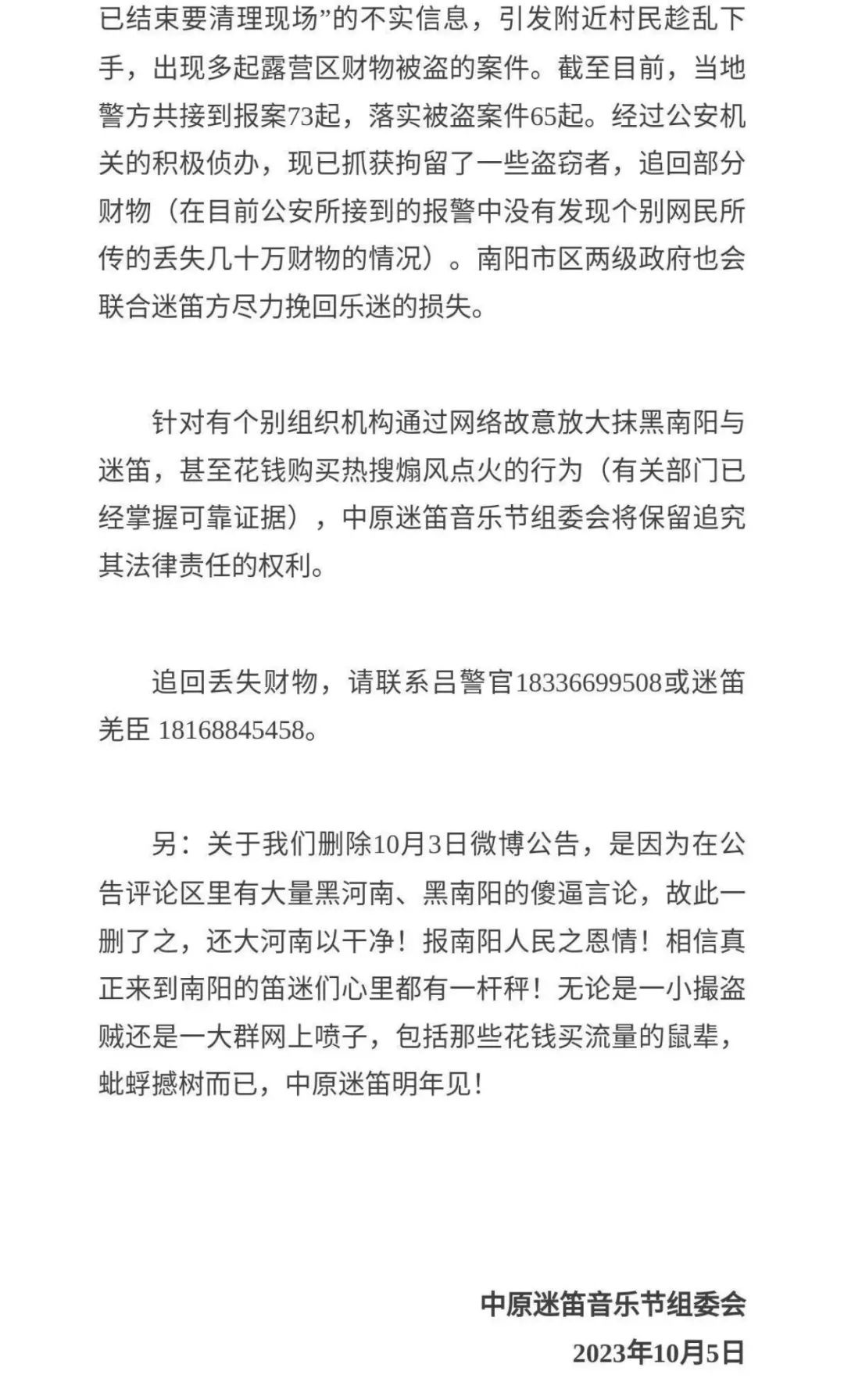 通告前半部分还正常,解释了陈某发布“活动已结束要清理现场”的不实信息,引发了村民趁乱下手,并报告了报案与落实情况。后半部分画风突变,其文曰:“删除10月3日微博公告,是因为在公告评论区有大量黑河南、黑南阳的傻逼言论,故此一删了之,还大河南以干净!报南阳人民之恩情!”