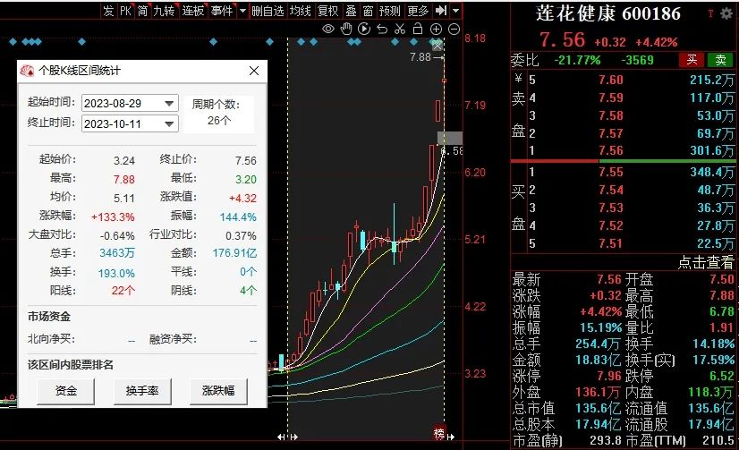10月11日收盘,莲花健康涨幅4.42%,报价7.56元,总市值135.6亿元。此前3个交易日,莲花健康实现3连板,8月29日以来,莲花健康股价涨超130%,市值增长了70多亿元。
