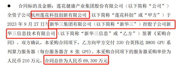 9月29日,莲花健康公告,根据公司战略发展规划,公司全资子公司莲花科创向新华三集团控股子公司新华三信息采购330台英伟达H800 GPU系列算力服务器,合同总价为6.93亿。