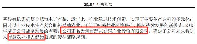 主业利润低迷之下,莲花健康谋求转型。2015年,莲花健康确定了公司未来将进入智慧农业和大健康领域的转型战略规划,名字从“莲花味精”变更为“莲花健康”。