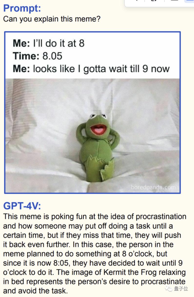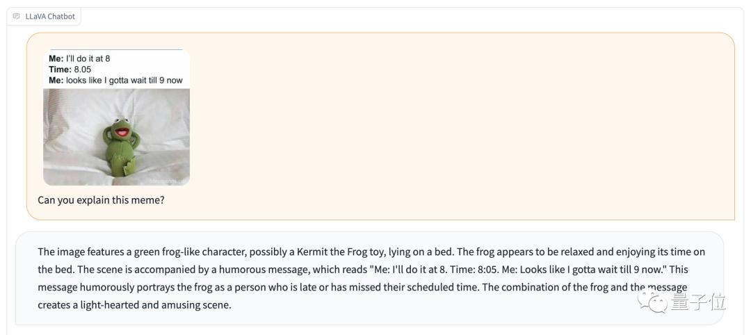 这次,LLaVA正确识别了图中的青蛙玩具和文字,而对表情包的解释,对了一半。