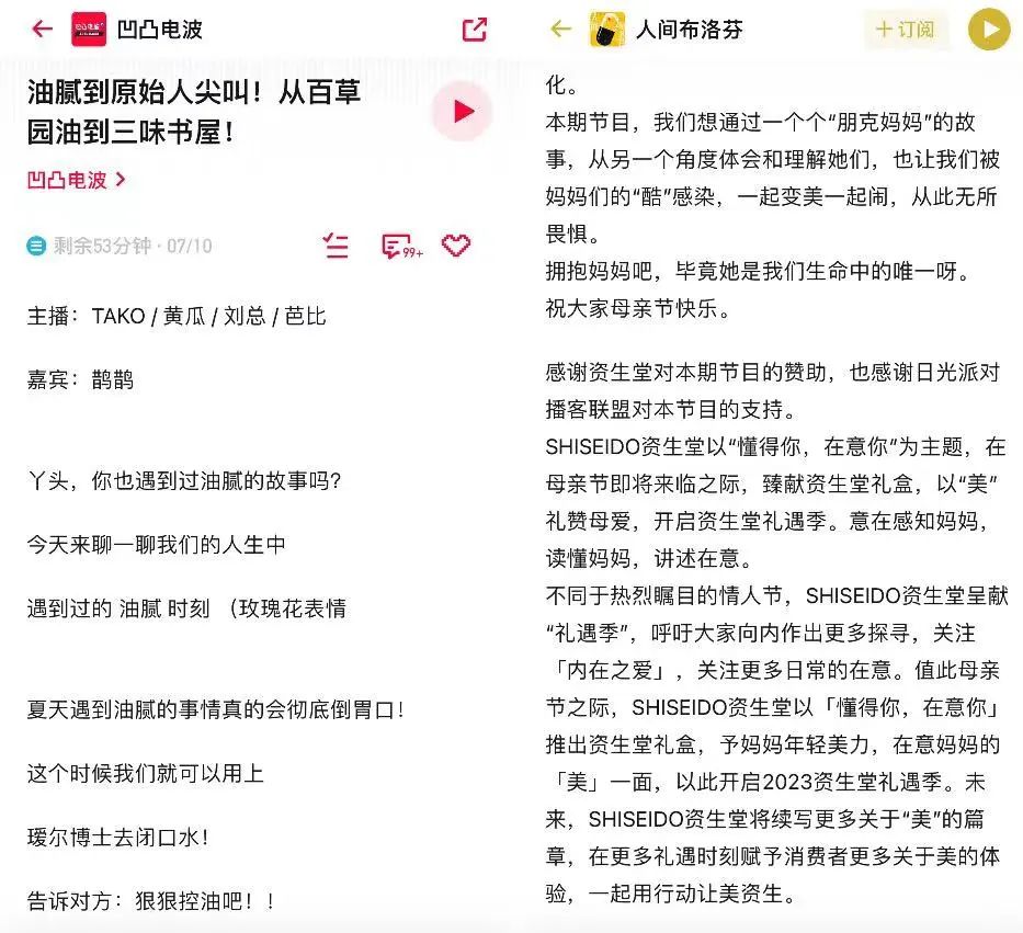 情人节前夕,资生堂时光琉璃与喜马拉雅推出播客栏目《爱如琉璃 饱满丰盈》,与「文化有限」、「fit4life | fitgirl weekly chat」、「来都来了 | 听了再走」三档播客合作定制节目;母亲节期间赞助「人间布洛芬」播客。
