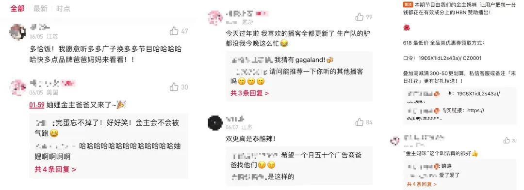 有部分美妆品牌在赞助播客节目的时候,通常会插入简短的口播,成本较小。另一方面,播客用户对于播客植入广告接受度较高,简短的广告也不易引发用户的反感。且优质播客栏目的用户粉丝粘性强,有时评论区还会出现“希望金主投广告以进行催更”的声音。