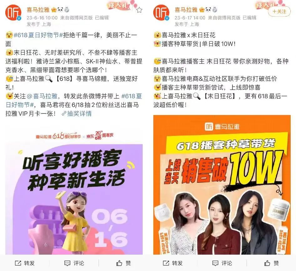 值得注意的是,播客还开启了“带货种草”模式。今年618,喜马拉雅联合京东发起“听享好播客,种草新生活”活动,联动多位播客主。据其微博显示,「末日狂花」种草带货曾获得单日破10万的成绩。这也在一定程度上表明播客的“带货”能力不容小觑。