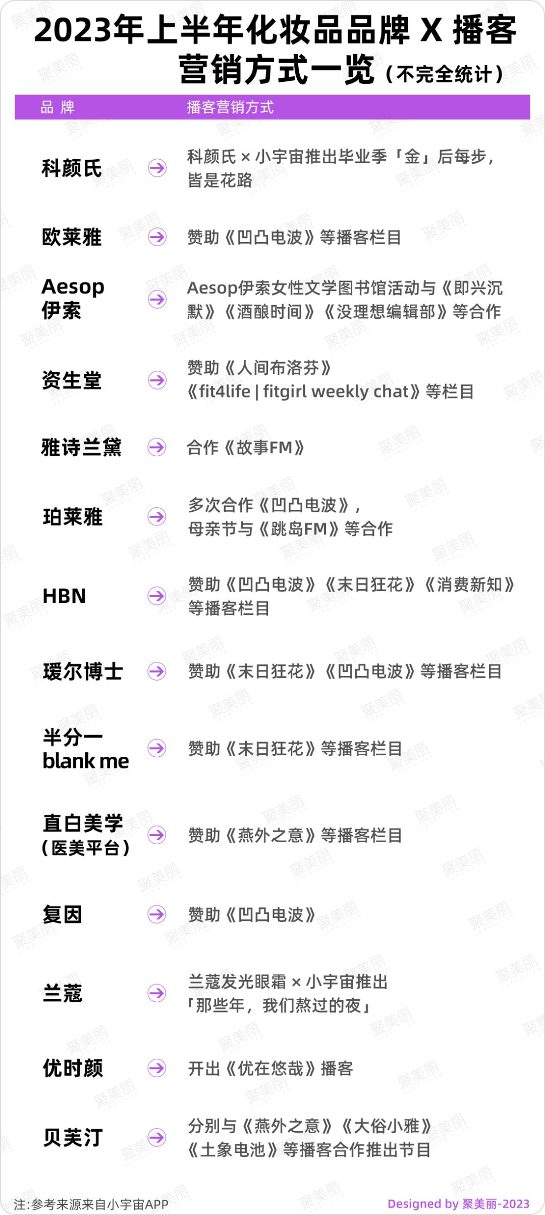 聚美丽通过盘点2023年上半年美妆品牌在播客上(主要统计来源为小宇宙APP)的合作及投放等,发现不仅国际企业,国内也有美妆品牌试水播客,以期触达更多消费群体。