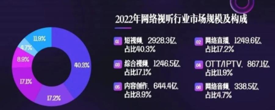 诚然,国内网络视听行业市场规模中占比最大的当属短视频板块,据《中国网络视听发展研究报告(2023)》显示,2022年,我国短视频占比网络视听行业市场40.3%,网络音频占比4.7%。