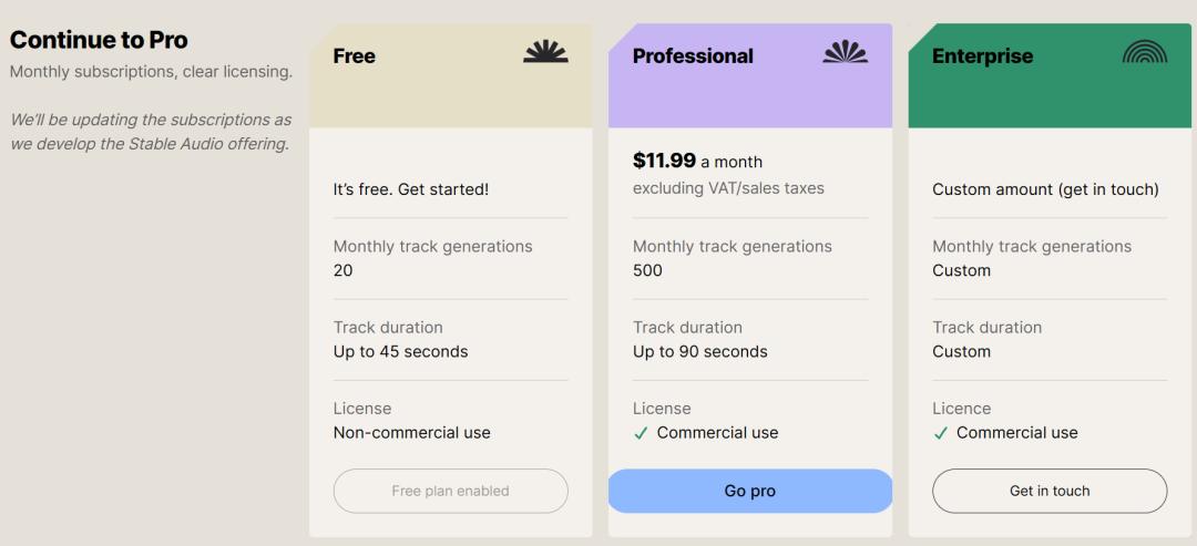 并且这次, Stable Audio 还专门在时长上下了一点功夫,普通版可以生成 45 秒以内的音频,想要更长的话,就升级个 PRO 版,可以连续生成 90 秒。
