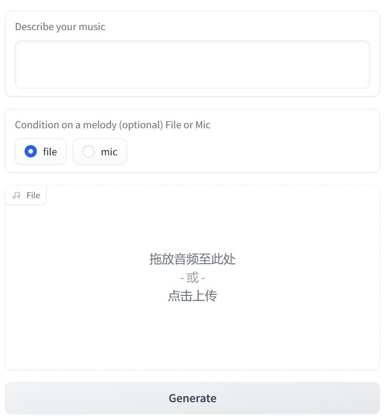 和 Stable Audio 不太一样的是,MusiacGen 在生成音乐时,提示词会更自由一点,不仅有文字的选项,还可以补充一些声音文件。