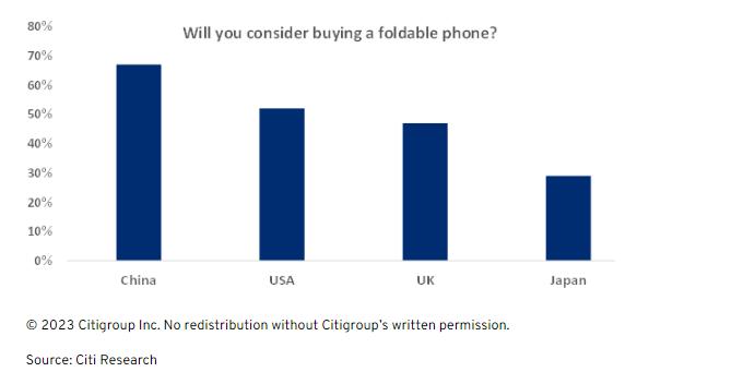 在折叠屏手机方面,值得注意的是,人们对折叠屏手机的兴趣有所提高。所有地区的用户(除日本外,去年未对该地区进行调查)都更有可能购买折叠屏手机。中国和美国两个国家消费者则愿意在折叠屏手机上支付更高的费用,与去年相比这一支出有所增加。折叠屏手机的关注度和价格偏好明显上升,越来越多的手机制造商进入了这一细分市场。