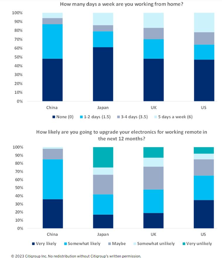 此外,花旗此次还调查了人们对远程居家办公的态度。约50%的受访者表示,他们每周至少在家工作两天,这表明自去年调查以来,远程居家办公的相关结果几乎没有变化。
