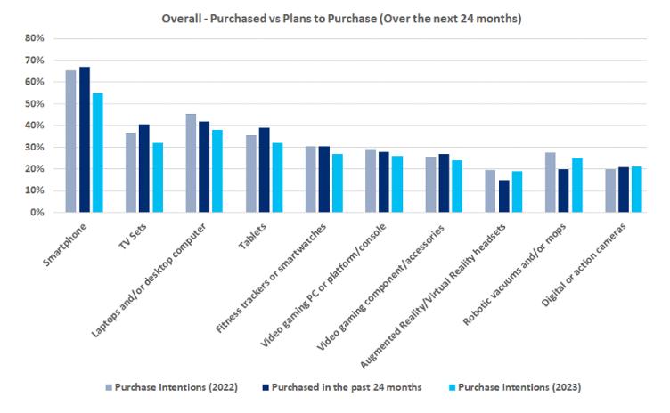 与之前相比,英国消费者未来的购买意愿在大多数类别中都有所下降,然而,AR/VR产品、清洁机器人产品和相机的购买意愿则保持稳定。除AR/VR、清洁机器人产品和数码相机外,与未来意向相比,所有类别的实际购买量都有所下降。