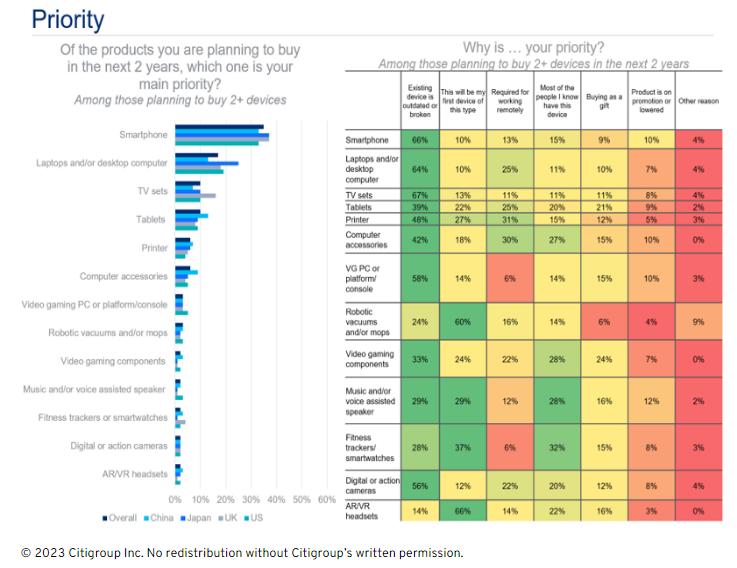 由于消费者需要升级到更新的设备或转移到5G设备,智能手机在短期内的优先购买列表和购买意向中名列榜首。从全球来看,受访者预计,更换现有智能手机的时间会稍早一些,这一数字从2.3年到2.5年不等。