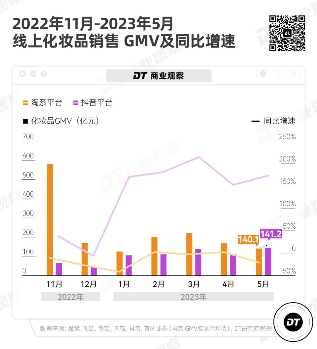 抖音在5月单月GMV超过淘系,主要是因为二者618大促节奏不同,而从第三方统计数据看6月的成交额,淘系美妆6月GMV为337亿,抖音则是128亿,仍然有挺大差距。