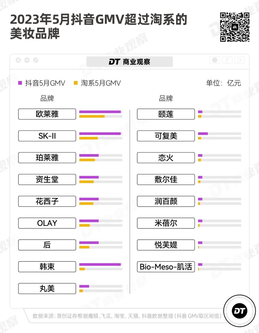 根据首创证券发布的《美妆:5 月抖音销售增势不减,国货品牌延续分化》,今年5月,抖音化妆品GMV(商品交易总额)首次超过淘宝天猫。