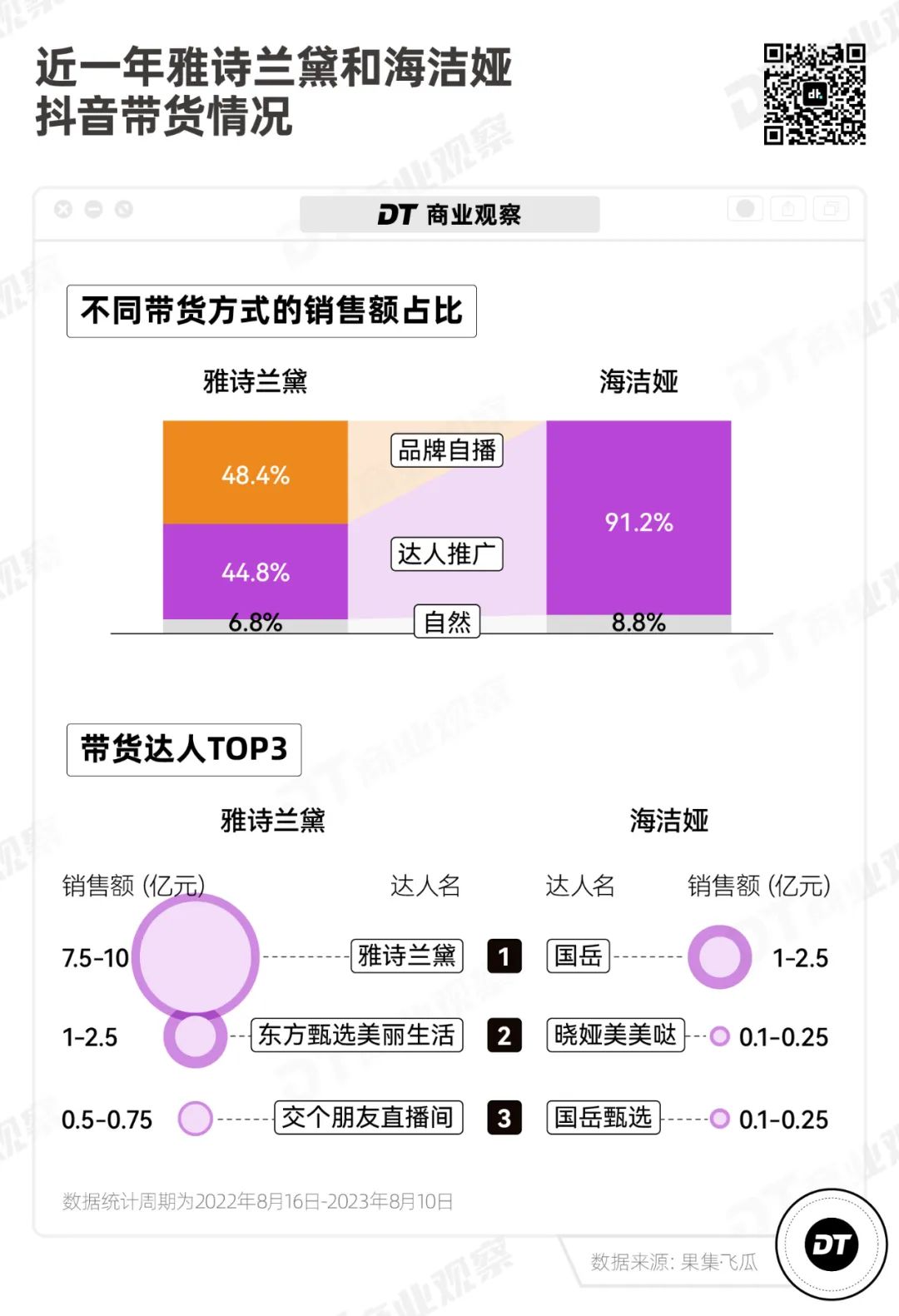 我们对比了一下雅诗兰黛和“抖品牌”海洁娅的销售额来源,发现海洁娅赚钱,主要还是依赖创始人自己或者某一达人直播带货。