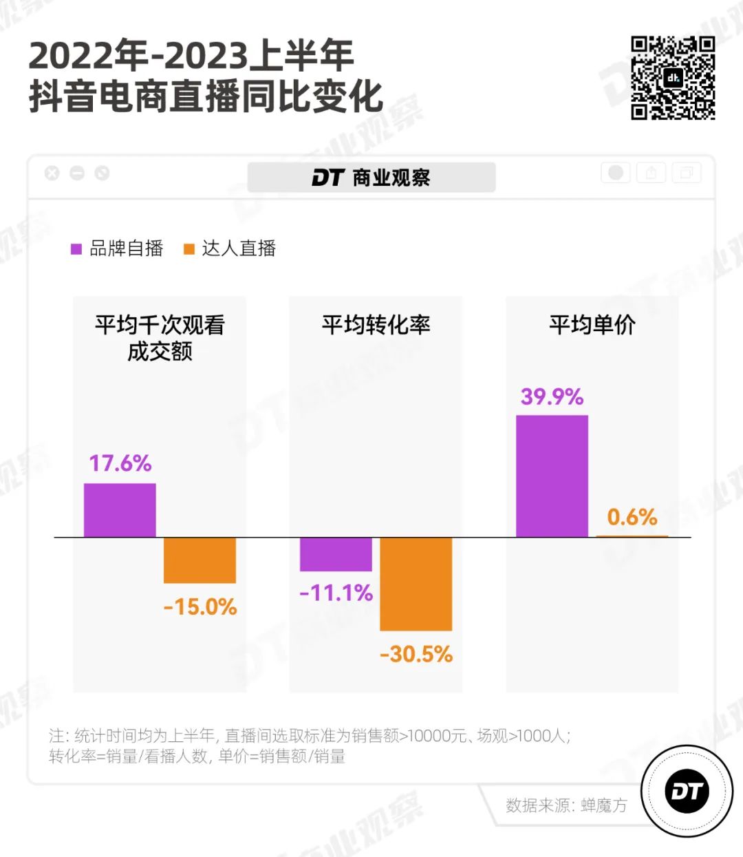 从2022年到2023年上半年,达人直播间的千次观看销售额则同比下降了15%,平均转化率下降了30.5%,且平均单价只上升了0.6%。