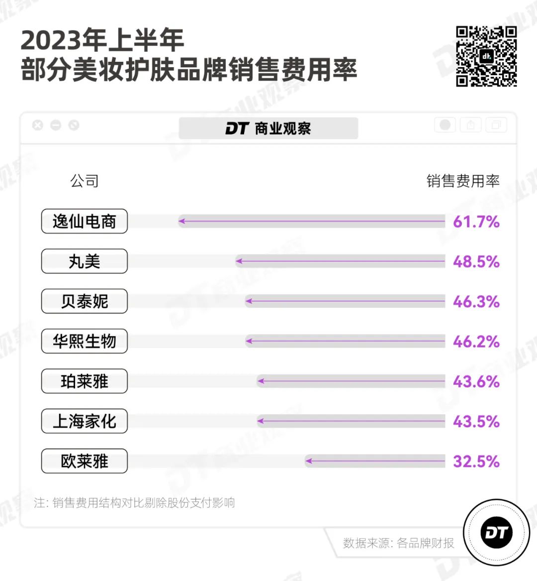 《DT商业观察》整理了部分美妆护肤品牌2023年上半年的销售费用率,基本上都在40%以上,就算是控制得比较好的大牌,这个数字也在30%以上。