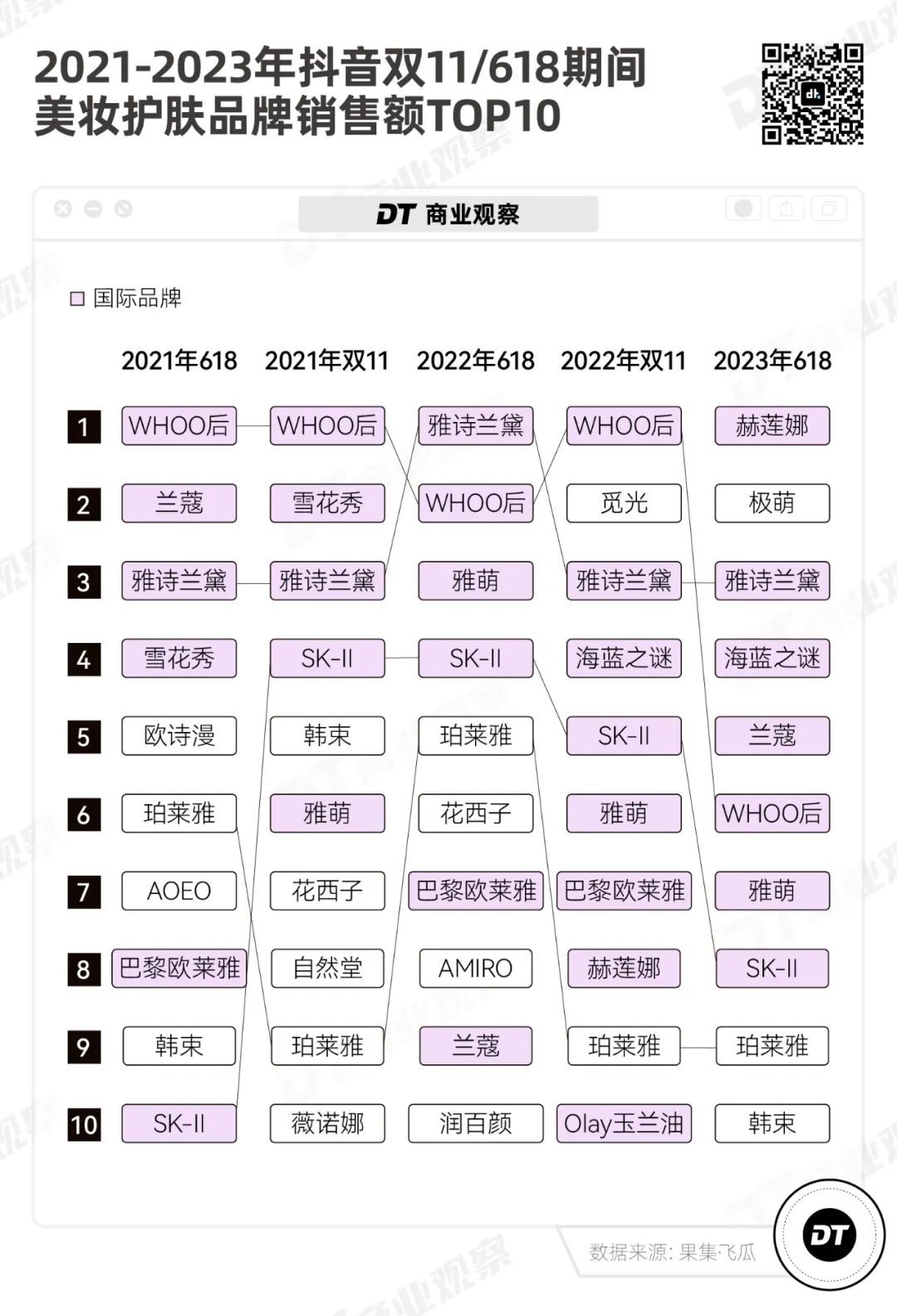 从2021年到现在,抖音618和双11期间美妆护肤销售额 TOP10的品牌中,国际大牌的比例上升明显。