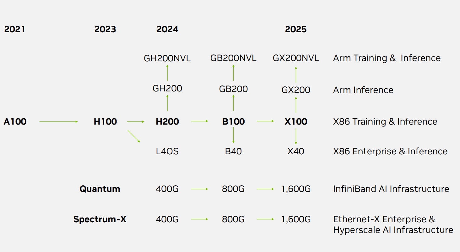而2025年的X系列,可能是一个代号,取代Blackwell GPU。从A100到H100,英伟达用了2年时间,H200也只是H100基于同一款hopper架构的更新产品,但BlackwellGPU和代号为x的新一代架构GPU按规划达到了一年出一款新产品的速度。