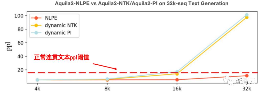 在代码、中英文Few-Shot Leaning、电子书等多个领域的文本续写实验显示,NLPE可以将4K的Aquila2-34B模型外延到32K长度,且续写文本的连贯性远好于Dynamic-NTK、位置插值等方法。