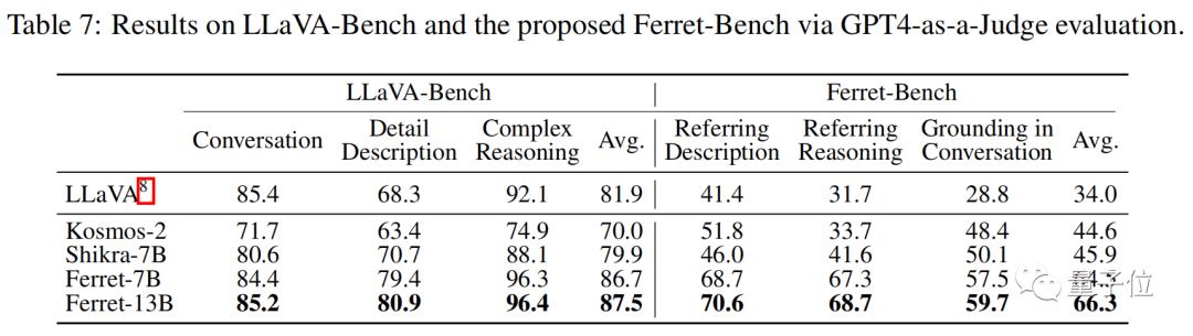 Ferret模型在LLaVA-Bench和Ferret-Bench上进行评估,在所有任务中都表现出色,特别是在需要指代和视觉grounding的三个新任务上,Ferret的表现很出色。