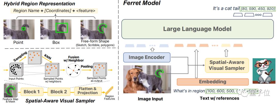 为了实现这一目标,Ferret模型的架构包括图像编码器、空间感知的视觉采样器和语言模型(LLM)等组成部分。