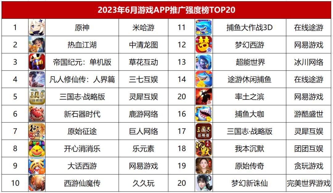 据AppGrowing的数据显示,2023年4月,《原神》首次出现在游戏APP推广强度榜TOP 20中,主打的是“新人送20抽”“原来你也玩原神”的情感触达,到了6月首次登顶榜首,之后一直是榜首的有力竞争者。