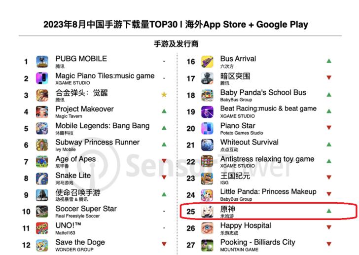 据Sensor Tower的数据显示,2023年6月《原神》在全球热门移动游戏收入榜中位列第8名,而到了7月与8月已无缘TOP 10。