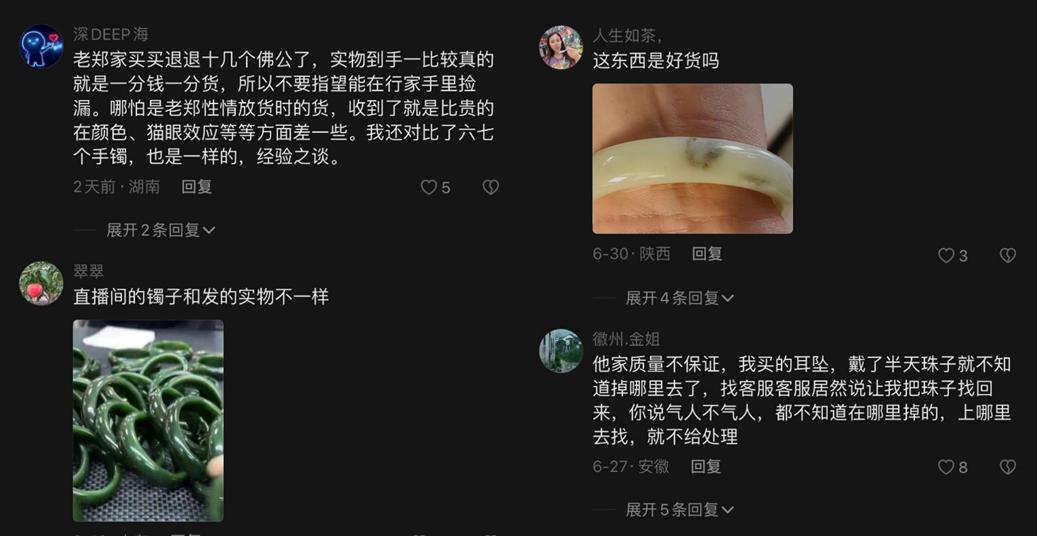 在@新疆和田玉老郑的评论区中,我们也看到了不少负面评论,集中体现为:货不对板、售后无保证等。这些负面评论很容易被围观用户顶到评论区的前列,不仅会对围观用户起到了“劝退”作用,也会影响用户的复购信心。