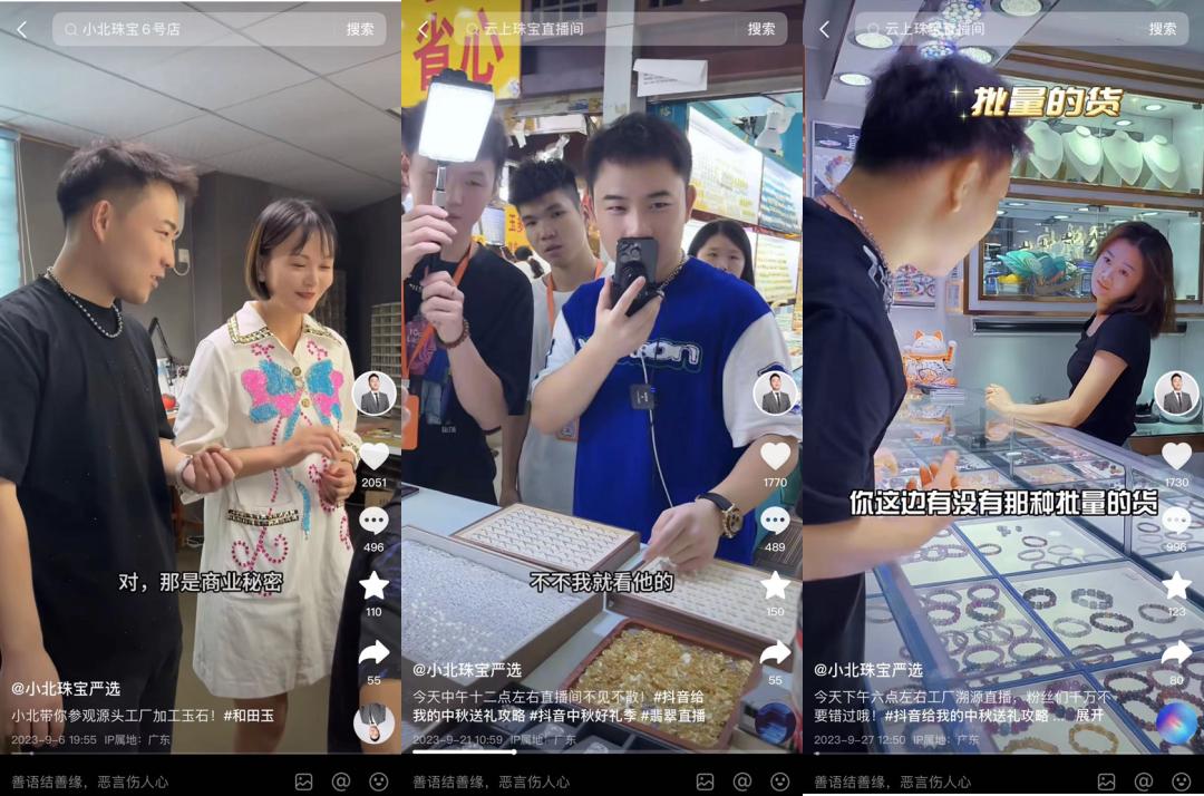 如果便宜是老郑获客的杀手锏,并会通过大量的预热、引流视频将“低价”“实力”人设坐稳,那另外两位主播@云上珠宝和@小北珠宝严选,则会在视频里加入更多的专业内容来打造自己的专业人设。