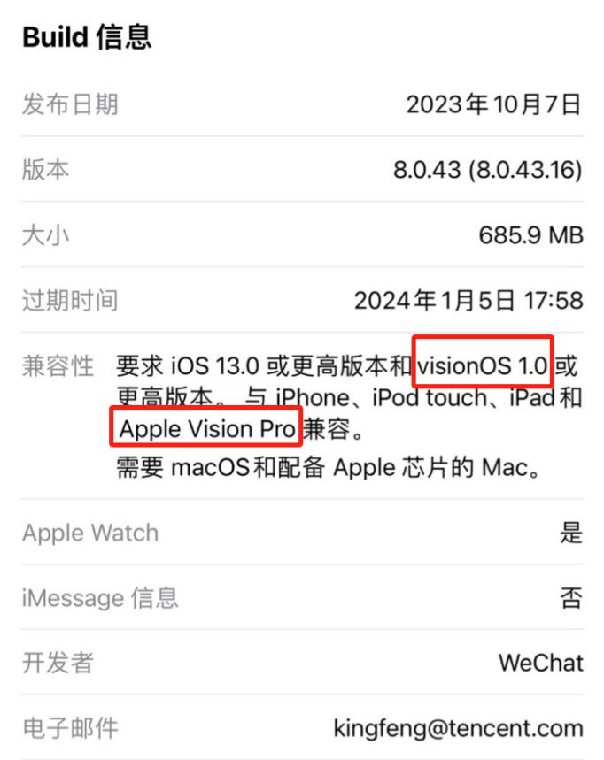 在此次内测版的“Bulid 信息”中,微信已经明确表示兼容 visionOS 1.0,与 Apple Vision Pro 兼容。
