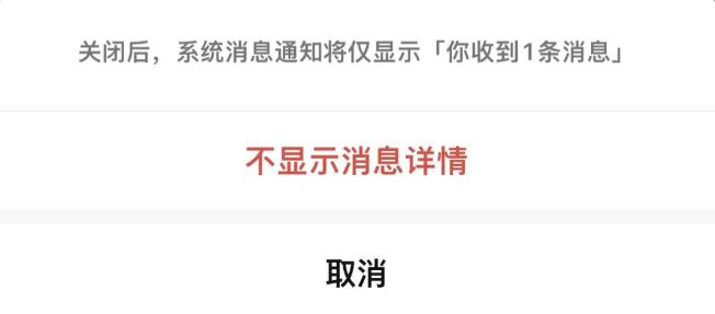 更新后改成了“关闭后,系统消息通知将仅显示「你收到1条消息」”,按钮变为“不显示消息详情”。