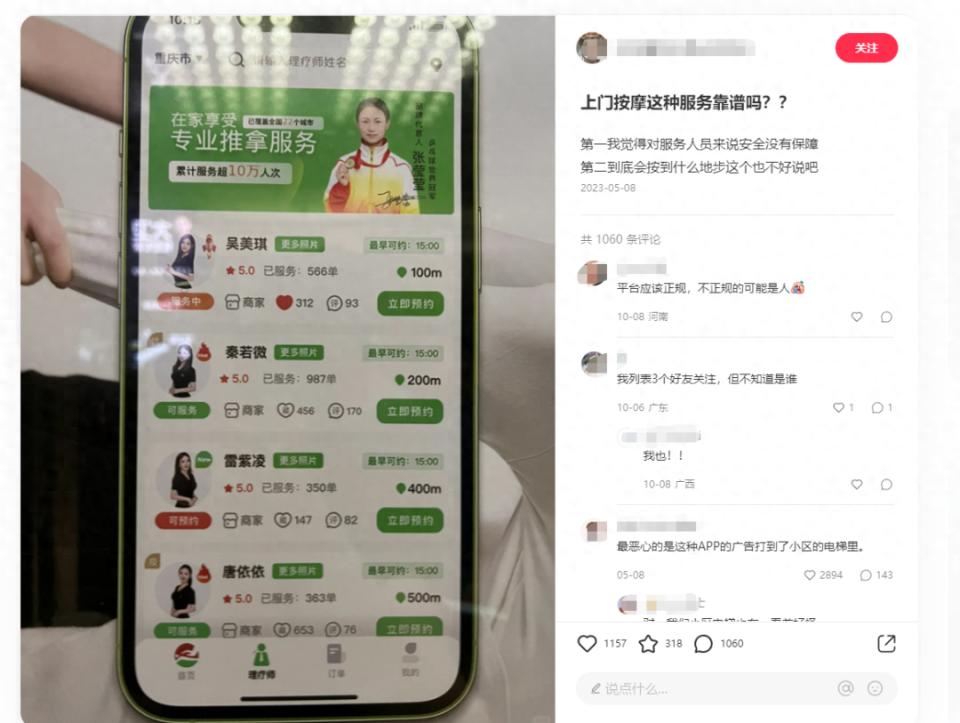 “开门”前:选择正规平台,核实服务提供者的身份信息、健康证明及各类资质证明,明确平台或商家确定的服务数量、质量标准,关注平台的投诉及意见反馈方式,以便对上门服务者的违约行为、侵权行为或“擦边行为”及时举报;