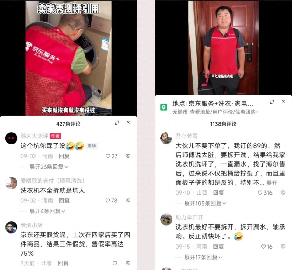 在抖音平台上,“鹏大大测评”发布视频显示,下单京东服务+上门清洁洗衣机,上门的师傅只是用刷子和布清洁滚筒、用蒸汽枪喷15秒左右,就完成了清洁,整个过程没有使用一点清洁剂和清洁膏。博主表示:“对服务非常不满意,第一,上门工作人员并不是京东服务的,而是京东接单后分发给当地的分包公司,第二,清洗工具和手法都非常不专业。”