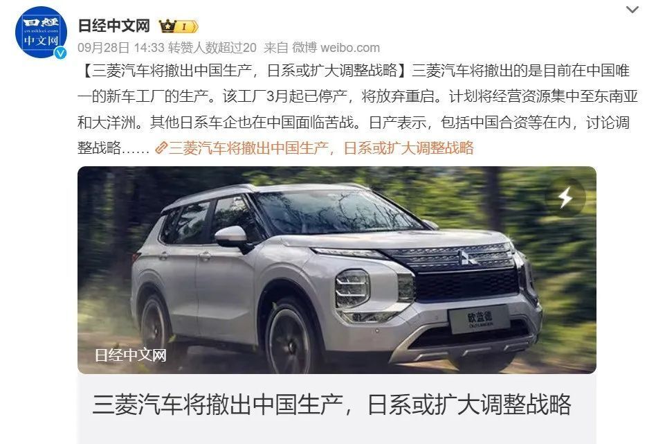 9月27日,据《日本经济新闻》报道,三菱汽车决定将停止在中国生产汽车,其已开始与广汽集团就此进行最终协商。