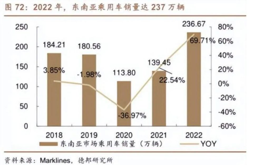 为什么把目光投向东南亚?人口红利和政策扶持是主要的原因。根据德邦研究所数据,2022年东南亚乘用车销量同比增速达到69.71%,至237万辆。人口基数够大、市场也有需求的情况下,东南亚政府也非常积极地推动汽车创新发展。