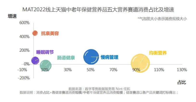 CBNData《2022全家营养第四餐消费趋势洞察》显示,2022年线上中老年保健营养品消费规模同比2020年几乎翻倍。其中眼部健康和骨关节保养品类均保持着近30%的消费占比,体重管理、功能零食类保健品增速超1200%,呼吸道保护、心脑血管呵护等细分品类增速也超过了400%。
