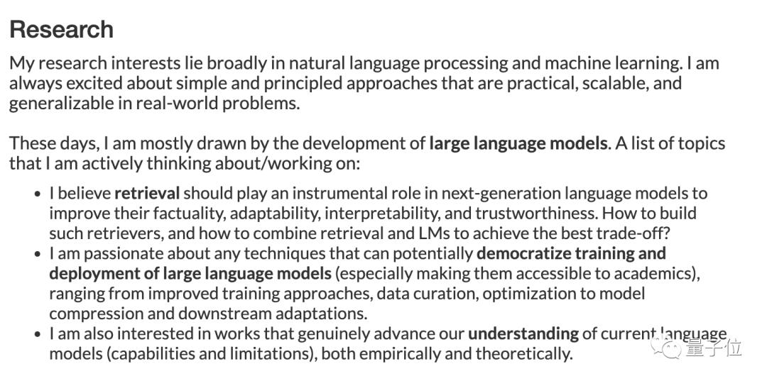 最近在个人主页中,陈丹琦更新了她的研究方向。
