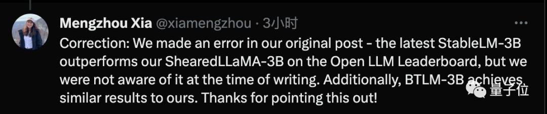 一作Mengzhou Xia刚刚发布一条更正,表示写论文时还是SOTA,论文写好就已经被最新的Stable-LM-3B超越了。