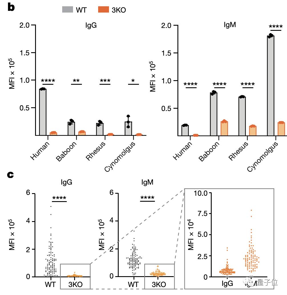 血清抗原-抗体反应实验结果表明,对于人类和其他灵长类动物,敲除猪的这三个基因后IgG和IgM抗体水平都明显下降,说明排斥反应大大降低。